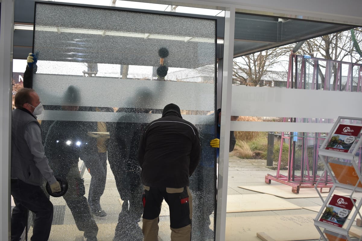 Am 3. März 2021 tauschte Glaserei Kunder eine kaputte Scheibe im Eingangsbereich unseres Verlagsgebäudes aus. Die 212 Kilogramm Scheibe war im vergangenen Sommer gesprungen.
