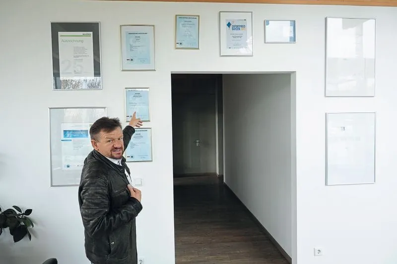 Viele Urkunden, von Auszeichnungen bis zu Patenten, präsentiert der Geschäftsführer von Fech Fenstertechnik stolz in seinem Unternehmen.