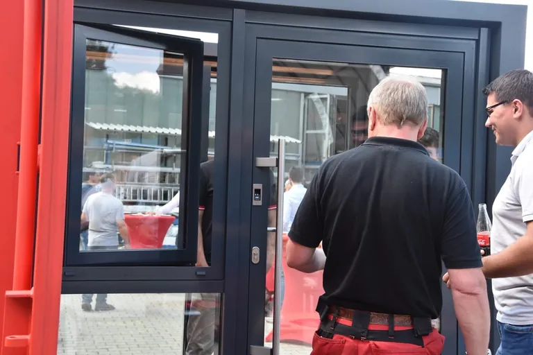 Als GFF in Straubing angekommt, sind die Mitarbeiter von Wicona noch mitten in den Aufbauarbeiten. Die zwei roten 5,5 mal 2,5 Meter großen Container stehen schon – sie waren kurz zuvor auf dem großen Hof von Straubinger Metallbau abgeladen worden. Nun sind die Details dran, damit, wenn sich in zwei Stunden die Mitarbeiter des Metallbaubetriebs aus Straubing die Produkte von Wicona ansehen wollen, alles aufgebaut ist – angefangen bei den Produkten bis hin zum Catering.