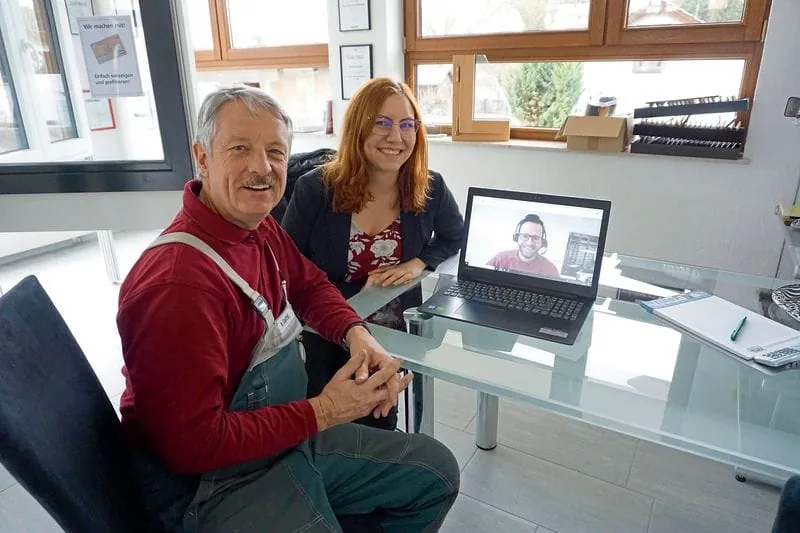 Skypen mit GFF: Glasermeister Wolfgang Gastel und Redakteurin Andrea Mateja in Aidlingen, Redakteur Matthias Metzger in den Redaktionsräumen in Bad Wörishofen (Monitor)