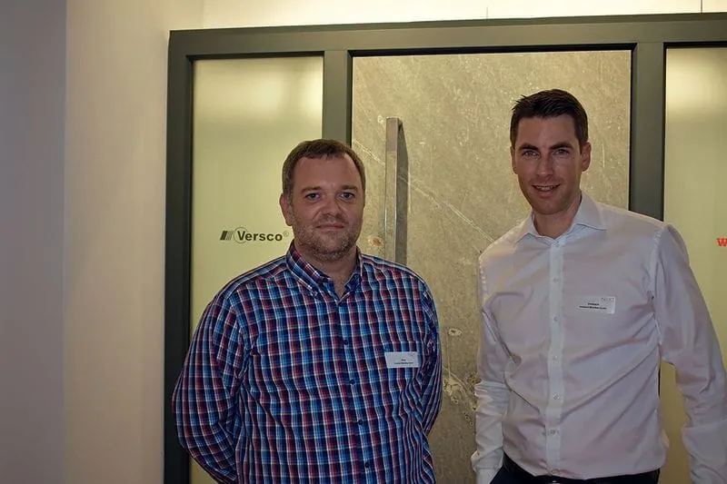 Patrick Versbach (re.), Inhaber von Versbach Metallbau, besuchte den Showroom zusammen mit seinem Mitarbeiter Andreas Walz. Die Location ist wirklich super. Wir von Versbach Metallbau sind begeistert. Seit drei Wochen ist unsere Keramikhaustür jetzt Teil der Exponate im Studio Next. Wir haben sie zusammen mit Wicona als Partner entwickelt. Das Konzept macht es uns möglich, unseren Betrieb und unsere Produkte einem breiteren Publikum vorzustellen. Diese Gelegenheit hat man sonst nicht. Es ist eine andere, interessante Streuung, die wir gerne nutzen. Weil wir aus der Nähe kommen, ist der Showroom für uns gut zu erreichen. Wir können uns vorstellen, auch an einer der vielen Veranstaltungen teilzunehmen. Das Studio ist für uns aber auch ein Ort, um andere Unternehmen und deren Produkte kennenzulernen. Wir können hier Verbindungen aufbauen und uns mit anderen austauschen. Damit nutzen wir eine Plattform, die es in dieser Art nirgendwo gibt. www.versco.de