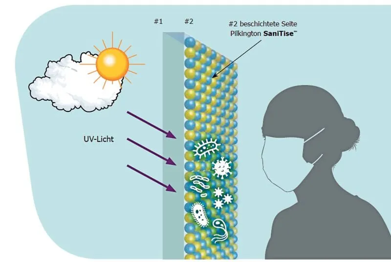 Dieses Wirkprinzip hat sich die NSG Group zunutze gemacht und ein Glas entwickelt, das eine antimikrobielle Wirkung gegenüber umhüllten bzw. behüllten Viren aufweist. Pilkington SaniTise soll den aktuellen Herausforderungen in den Bereichen Gesundheit und Sicherheit Rechnung tragen. Dank der antiviralen Eigenschaften stoppt das Glas die Verbreitung von Viren, Bakterien und Pilzen in öffentlichen Bereichen wie Einkaufszentren, Krankenhäusern, Pflegeheimen, Schulen und Verkehrsmitteln. Besonders im Kampf gegen die Corona-Pandemie soll es ein probates Mittel darstellen, um die Ausbreitung des SARS-CoV-2-Erregers einzudämmen.