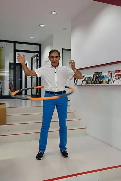 Bernhard Helbing ist mit 65 Jahren fit wie ein Turnschuh. Im Gespräch vermittelt er den Eindruck, als sei diese Fitness eine Grundlage für mentale Stärke und klare Entscheidungen. Am Hula-Hoop-Reifen versuchte er sich zunächst vergeblich, während des Urlaubs im niederbayerischen Bad Füssing. Das ließ er nicht auf sich sitzen.