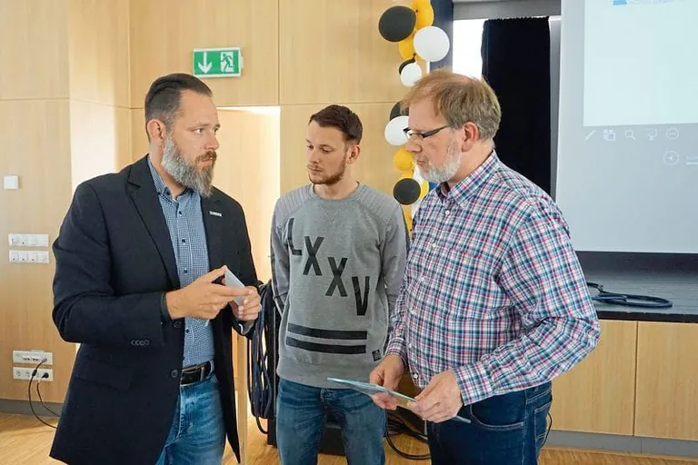 „Wer Glas betrachtet, der sieht oft nicht, mit welchen Funktionen es angereichert ist – der Mehrwert ist unsichtbar“, sagte Jürgen Kün-sting (li.) im Gespräch mit Berufsschüler Kai Wranik (Mitte) und mit Lehrer Michael Höhler. - © xxx