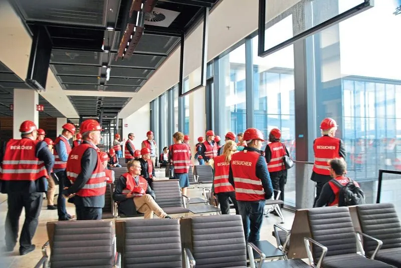 Nach dem gemeinsamen Programm von Schüco, Vetrotech Saint-Gobain und Gretsch-Unitas zum Thema vernetzter Sicherheit und Gebäudetechnik gab es für die zirka 100 Teilnehmer eine Führung durch das noch im Bau befindliche BER-Terminalgebäude des Hauptstadtflughafens.
