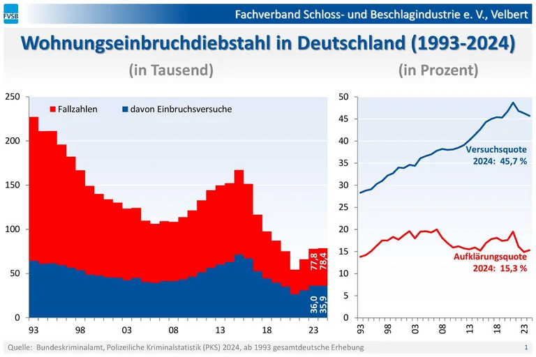 Für das Jahr 2024 verzeichnet die bundesweite Polizeiliche Kriminalstatistik (PKS) einen leichten Anstieg (0,8 Prozent) beim Wohnungseinbruch. Insgesamt wurden 78.436 Fälle einschließlich der Einbruchsversuche erfasst. Das sind 617 Fälle mehr im Vergleich zum Vorjahr (2023: 77.819 Fälle).