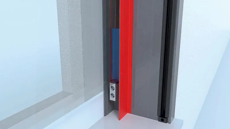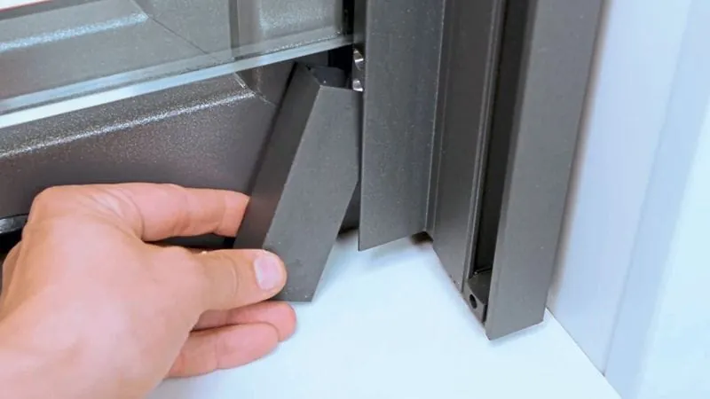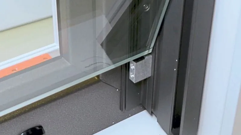 4. Schritt: Montieren Sie die Glasscheibe. Stellen Sie sie unten auf den beiden EPDM-Streifen ab und platzieren Sie die Verglasungsklötze.