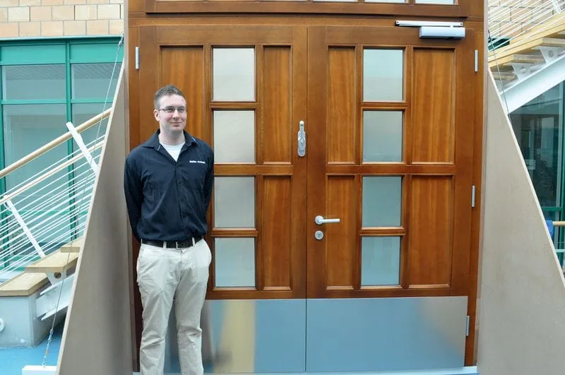 Im dritten Teil der Serie stellen wir das Meisterstück von Steffen Armbrust vor. Dabei handelt es sich um eine zweiflügelige Holztür mit einem Oberlicht in der Form eines Rundbogens. Die Besonderheit ist der verdeckt liegende Treibriegel, der von außen nicht sichtbar ist.