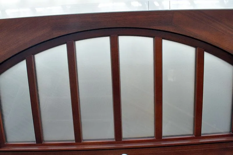 Die Türflügel sind mit 3-D-Bändern am Türrahmen befestigt. Während der Gehflügel über eine Dreifachverriegelung verfügt, ist der Stehflügel mit einem Treibriegel gesichert. Als Besonderheit hat Armbrust das Gestänge vollständig verdeckt liegend montiert. „Den in den Flügel gefrästen Schlitz habe ich mit entsprechendem Matrial ausgeleimt, so dass nur ein Kanal von 15 mal 15 Millimeter bleibt.“ Darauf aufgesetzt ist die Schließleiste. Die aufwändigste Arbeit war laut Armbrust aber das Oberlicht in Form eines Rundbogens. „Dafür musste ich Schablonen anfertigen, nach den Schablonen fräsen und sogar Maschinen umbauen.“ Auch das Einsetzen der Sprossen und das Hineinschneiden der Glasleisten hätten viel Zeit in Anspruch genommen. Als Scheiben kommen im Oberlicht und in den Flügeln Zweifach-Isoliergläser zum Einsatz. Das Ornamentglas außen ist als ESG ausgeführt, innen befindet sich aus Sicherheitsgründen sechs Millimeter VSG.