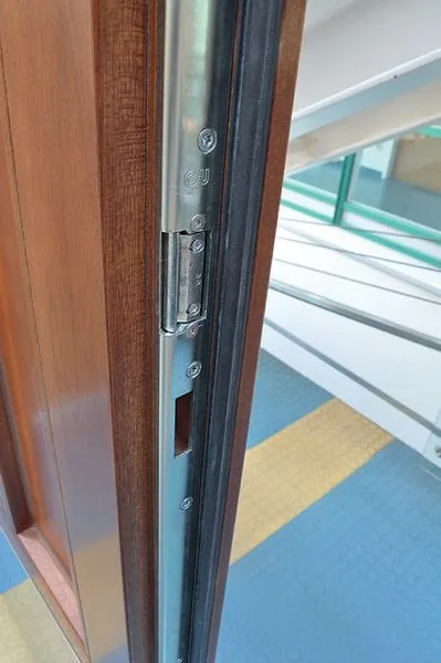 Das Element dient als Einfahrts- und Zugangstor zum Innenhof eines Mehrfamilienhauses. Der Entwurf dafür stammt aus der Feder eines Architekten. In Absprache mit diesem wählte Steffen Armbrust für die Tür die Holzart Meranti aus. „Meranti ist witterungsbeständig. Allerdings handelt es sich um ein Tropenholz – das ist der Nachteil“, erklärt Armbrust. Innen wie außen schützt eine Trittleiste aus Edelstahl die Tür vor Beschädigungen.