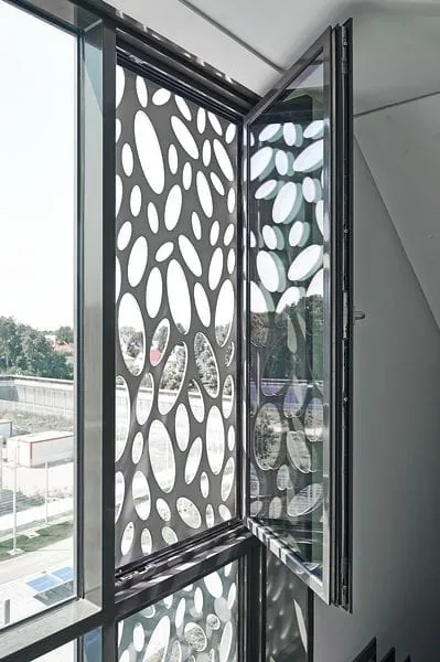 Ein zweiteiliges Standardfenster – bestehend aus einem großformatigen, mit transparentem Spezialsicherheitsglas fest verglasten Element und einem verglasten, zu öffnenden Lüftungsflügel mit davor befindlichem Lochpaneel als ornamentalem Schmuckelement – prägt die Fassade des ansonsten zurückhaltend gestalteten Funktionsbaus. Das ausbruchsichere Lochpaneel gestalteten die Architekten im Zuge der Entwurfsplanung. Es handelt sich um ein zwölf Millimeter dickes Stahlblech aus Hartmangan mit ellipsenförmigen Ausschnitten in unterschiedlichen Abmessungen. Die Herstellung der Lochpaneele erfolgte mithilfe von Lasertechnik. Entsprechend der Sicherheitsanforderungen an Gitter beträgt die maximale Abmessung zwölf mal 30 Zentimeter. Dieses Lochblech ist in der Pfosten/Riegel-Konstruktion so befestigt, dass es bis zu einer horizontalen Zugkraft von 30 Kilonewton nicht herausgerissen wird. Die Belastungsprüfung erfolgte an der MFPA Leipzig. Einer gutachterlichen Stellungnahme zufolge konnte damit auf die Gitter vor den Fenstern verzichtet werden.